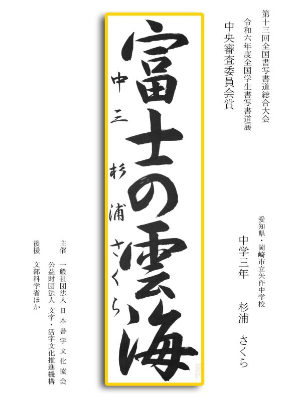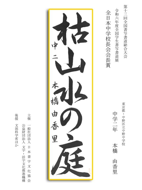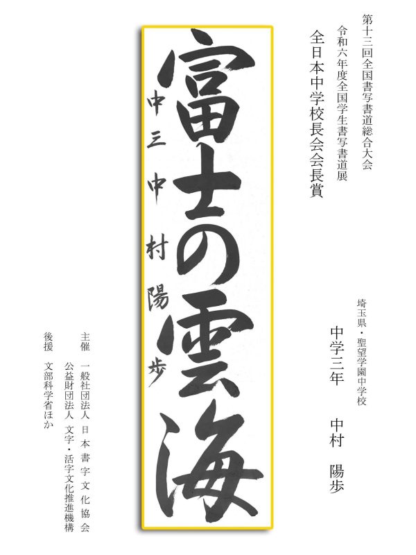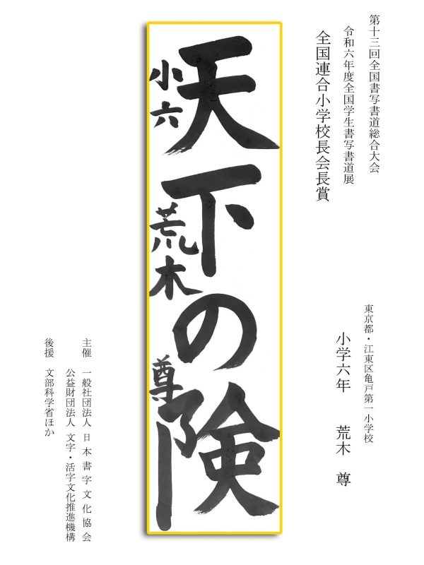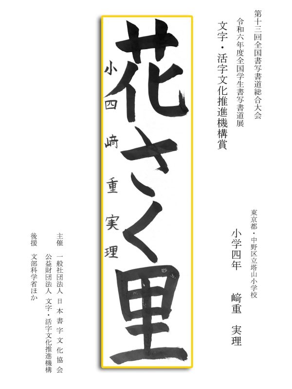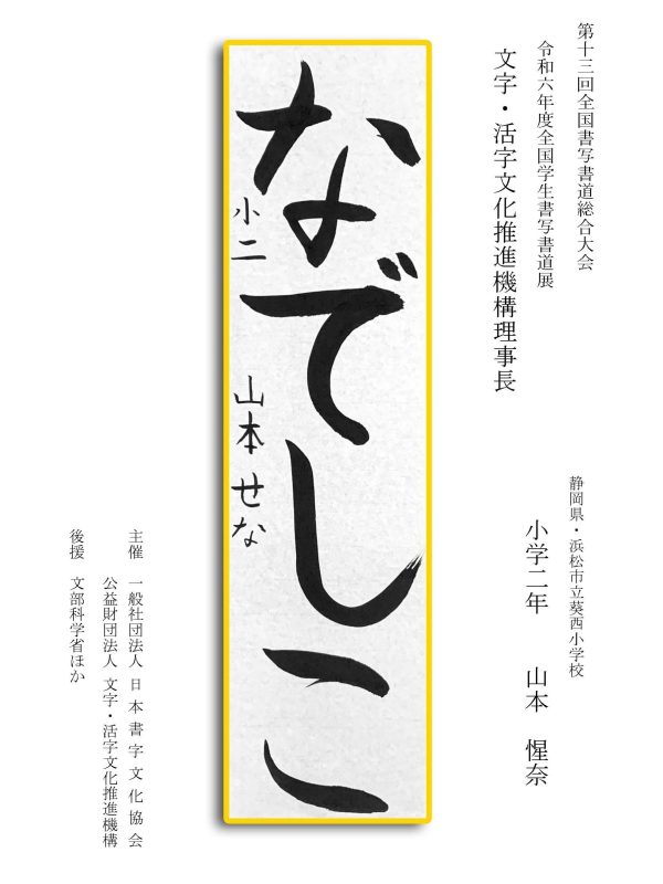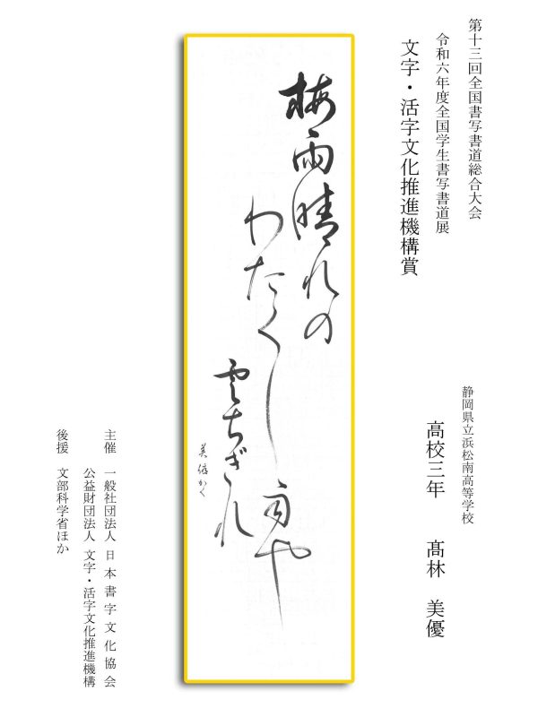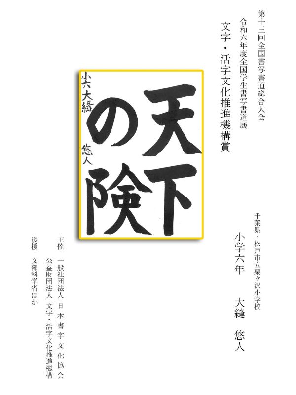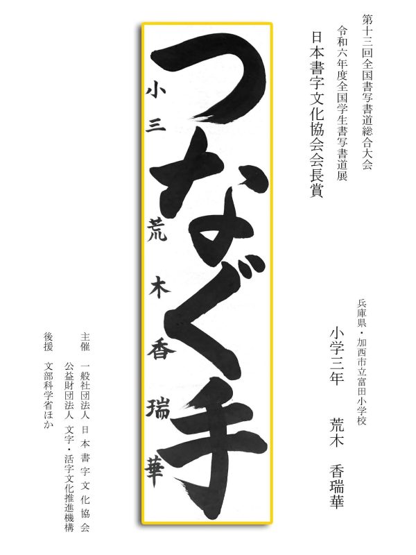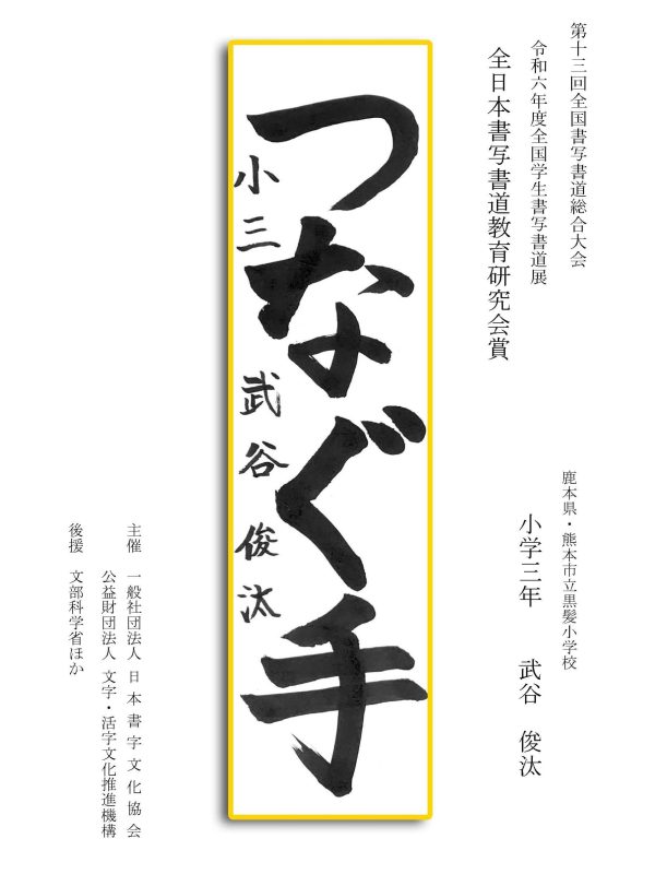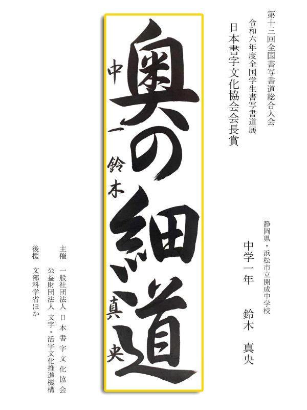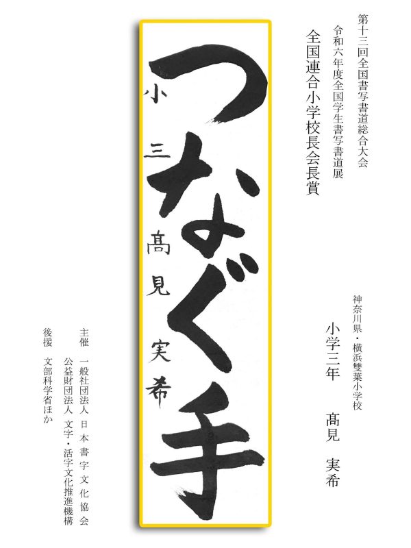 第13回全国書写書道総合大会 令和6年度全国学生書写書道展上位受賞作品はこちら 令5年度ひらがな・かきかたコンクール上位受賞作品 令和5年度全国学生書写書道展上位受賞作品 文部科学大臣賞 中央審査委員会賞 日本書字文化協会会長賞 文字・活字文化推進機構理事長賞 全国連合小学校長会長賞 全日本中学校長会会長賞 全国高等学校長協会会長賞 全日本書写書道教育研究会会長賞 中央審査委員長奨励賞 日本書字文化協会賞 文字・活字文化推進機構賞 全日本書写書道教育研究会賞