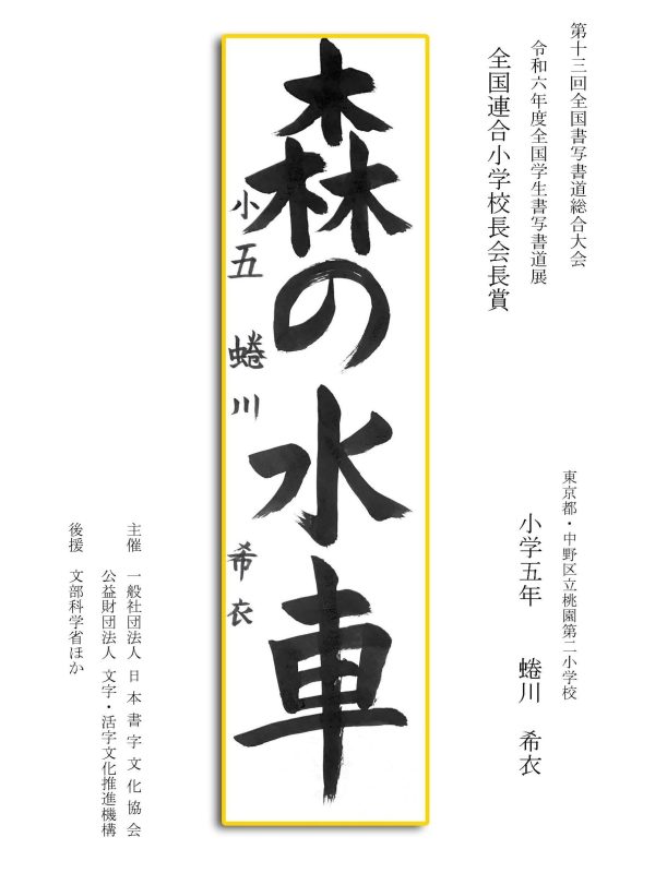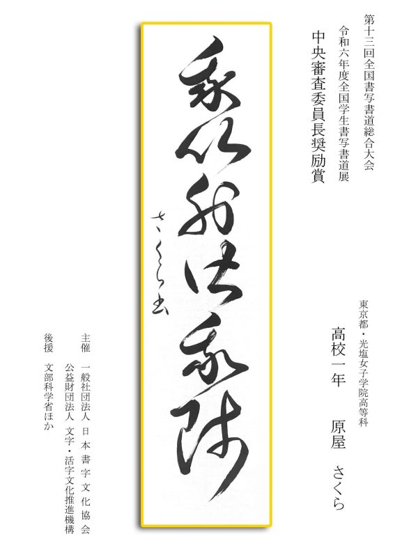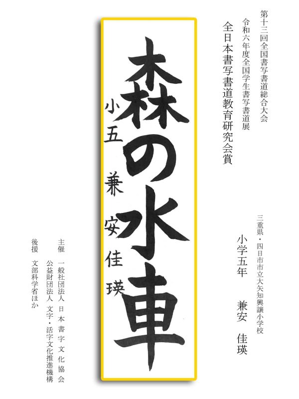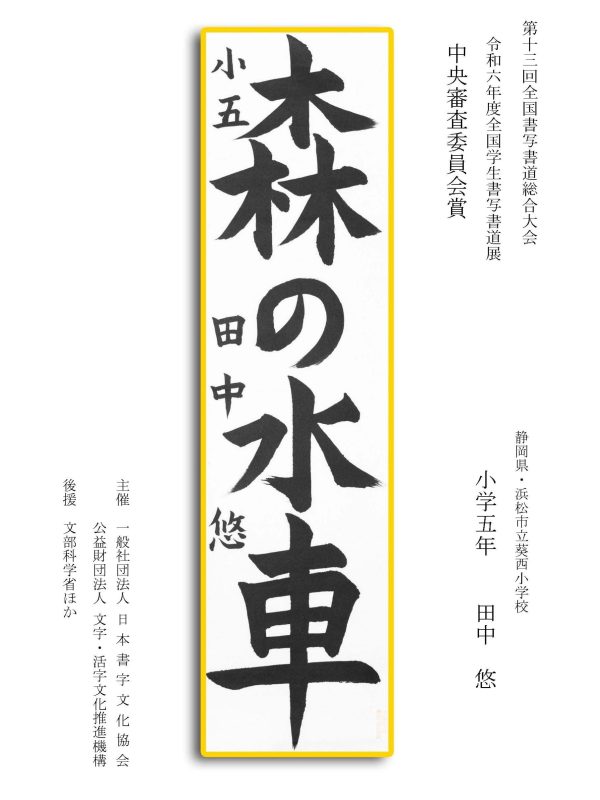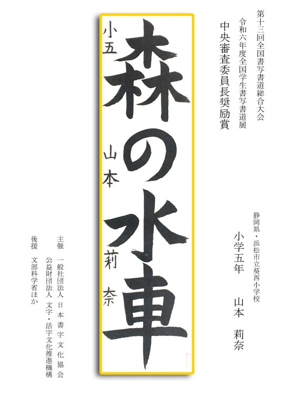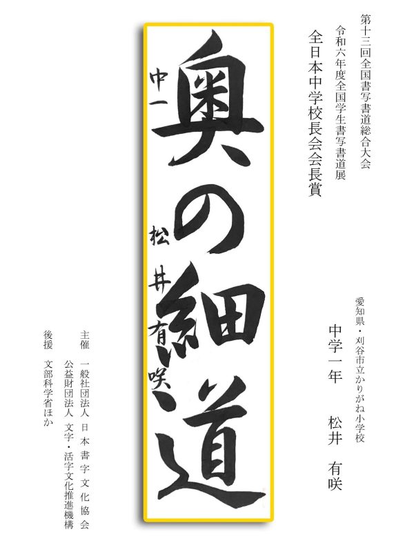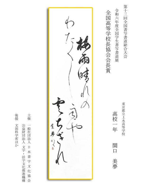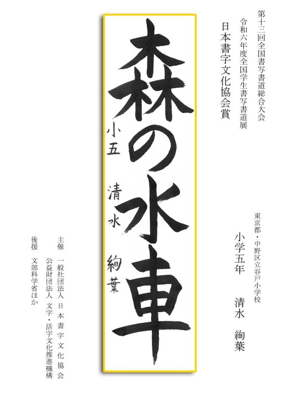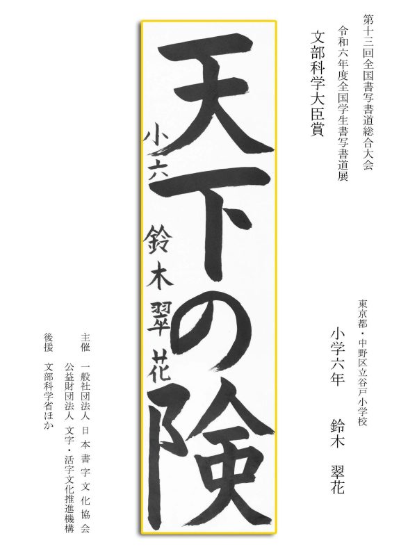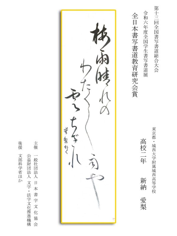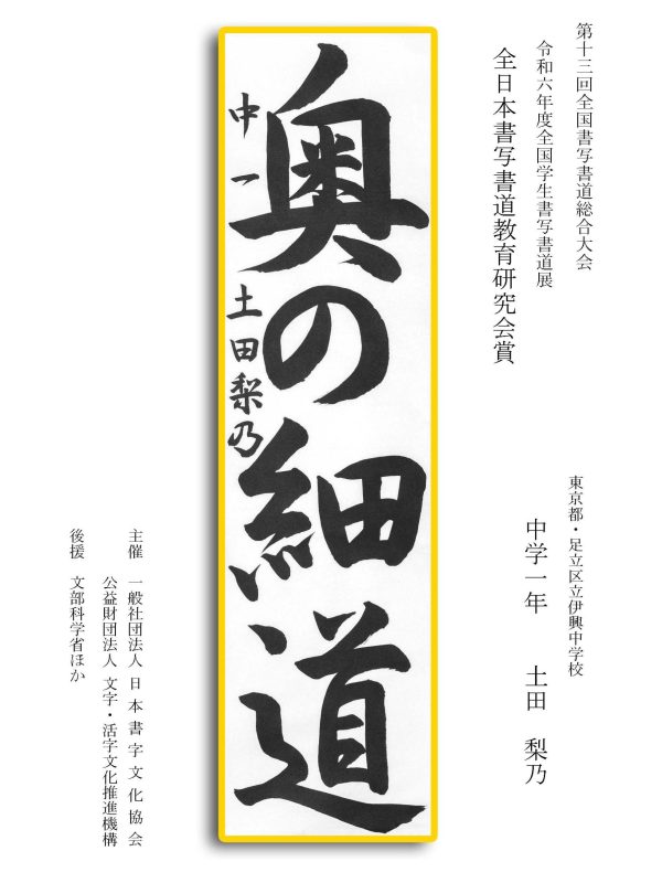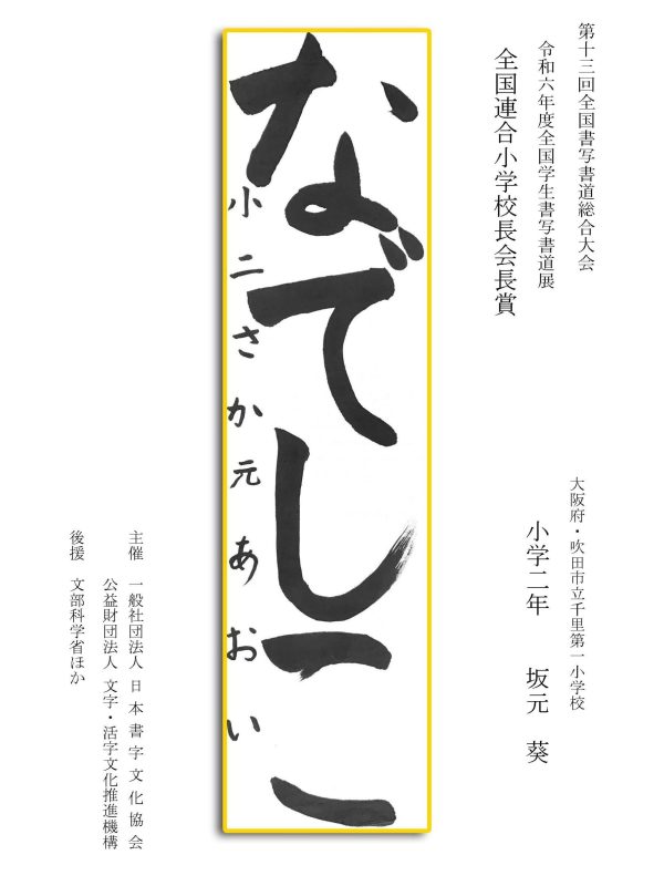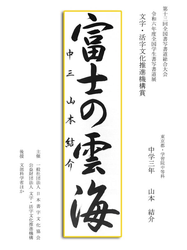 第13回全国書写書道総合大会 令和6年度全国学生書写書道展上位受賞作品はこちら 令5年度ひらがな・かきかたコンクール上位受賞作品 令和5年度全国学生書写書道展上位受賞作品 文部科学大臣賞 中央審査委員会賞 日本書字文化協会会長賞 文字・活字文化推進機構理事長賞 全国連合小学校長会長賞 全日本中学校長会会長賞 全国高等学校長協会会長賞 全日本書写書道教育研究会会長賞 中央審査委員長奨励賞 日本書字文化協会賞 文字・活字文化推進機構賞 全日本書写書道教育研究会賞