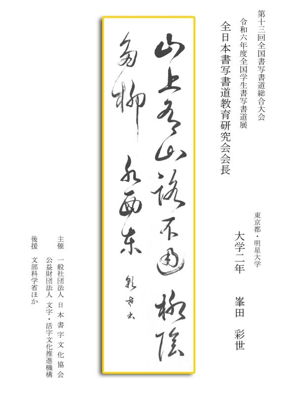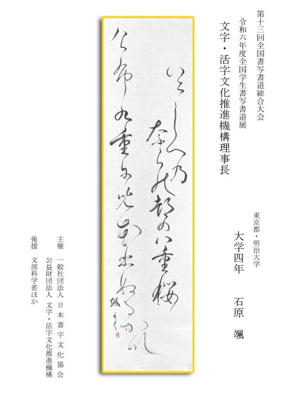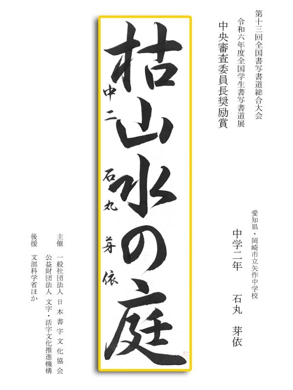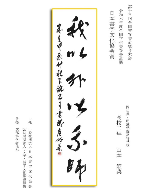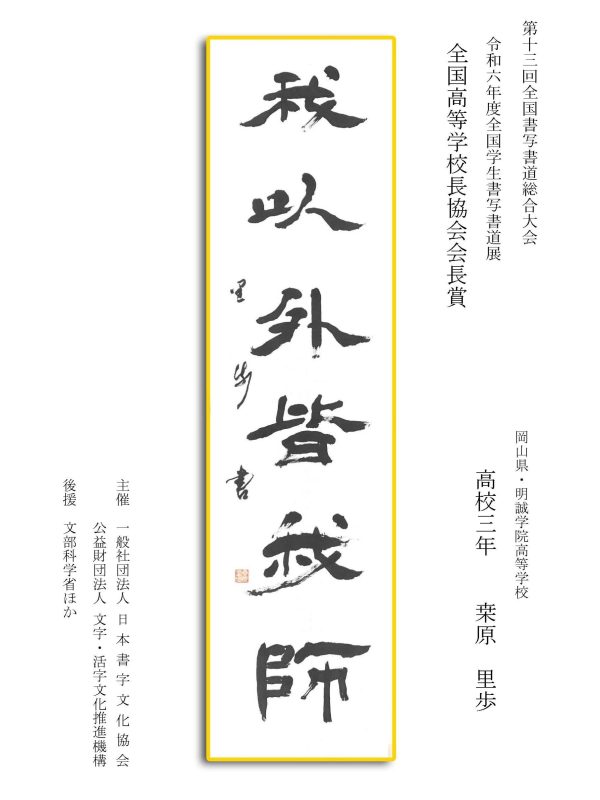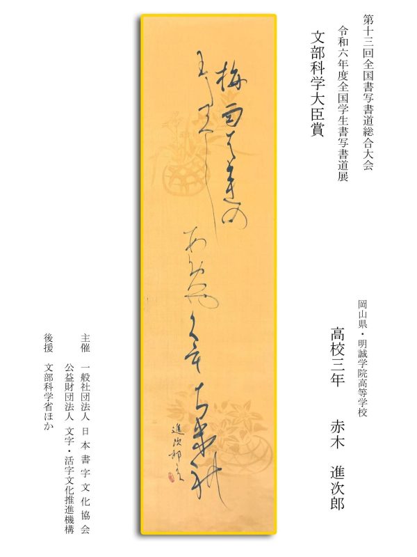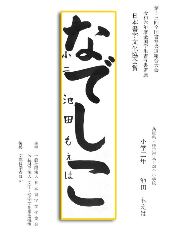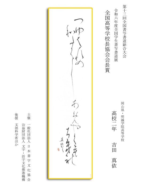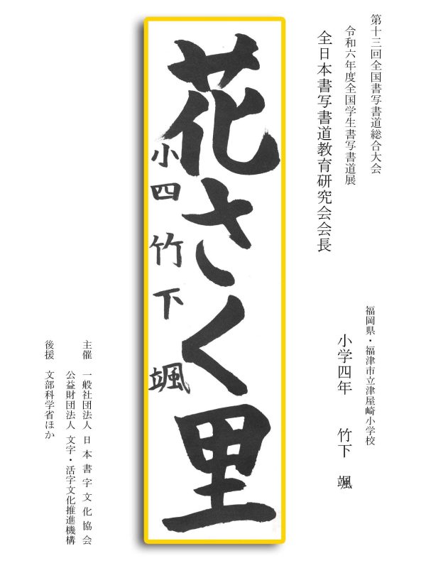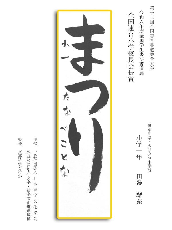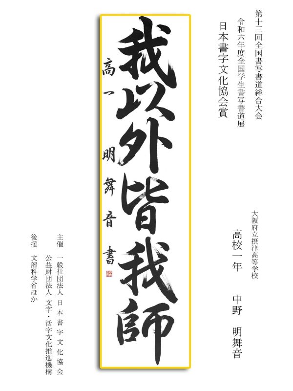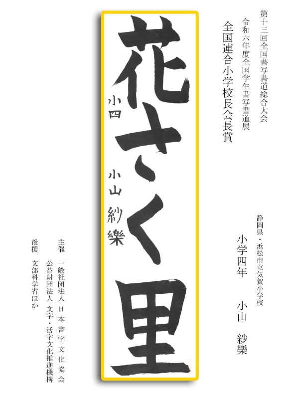 第13回全国書写書道総合大会 令和6年度全国学生書写書道展上位受賞作品はこちら 令5年度ひらがな・かきかたコンクール上位受賞作品 令和5年度全国学生書写書道展上位受賞作品 文部科学大臣賞 中央審査委員会賞 日本書字文化協会会長賞 文字・活字文化推進機構理事長賞 全国連合小学校長会長賞 全日本中学校長会会長賞 全国高等学校長協会会長賞 全日本書写書道教育研究会会長賞 中央審査委員長奨励賞 日本書字文化協会賞 文字・活字文化推進機構賞 全日本書写書道教育研究会賞