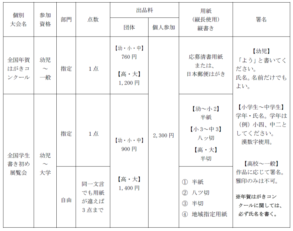幼稚園・保育園、学校については出品・参加によって学校会員と認定され10%割り引かれます。また、参加児童生徒1人につき参考手本と年賀はがき清書用紙2枚は無料です。送料はご負担ください。